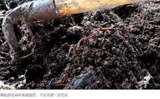 有時(shí)候,哪怕濕垃圾里混雜著大量干垃圾,蚯蚓也照吃不誤,它們?cè)谶M(jìn)食時(shí)會(huì)避開干垃圾,只吃腐殖質(zhì),最終蚯蚓田里的干垃圾一目了然,相當(dāng)于一臺(tái)垃圾自動(dòng)分揀機(jī)。