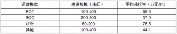 從不同運(yùn)營(yíng)模式來看,相對(duì)政府投資而言,BOT、BOO模式建設(shè)成本明顯更低,且由于很多小規(guī)模的處理設(shè)施采用政府投資或BOT模式建設(shè),導(dǎo)致這兩種模式的平均噸投資大幅高于BOO模式。