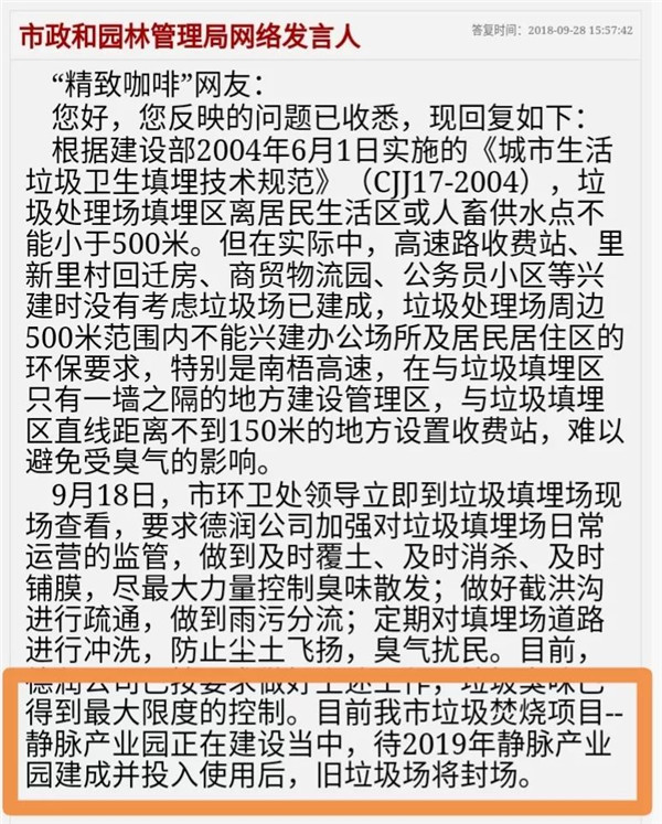 針對(duì)相關(guān)問(wèn)題,市市政和園林管理局網(wǎng)絡(luò)發(fā)言人作出了回應(yīng),表示會(huì)進(jìn)一步督促垃圾填埋場(chǎng)的管理方加強(qiáng)對(duì)日常運(yùn)營(yíng)的監(jiān)管工作?;貜?fù)中還提及重要一點(diǎn)——
