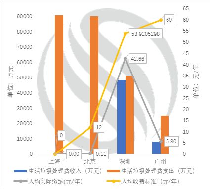 而在居民小區(qū)方面,北京市的收費力度較小,仍沿用1999年收費標(biāo)準(zhǔn),常住居民3元/月/戶;外地來京人員2元/月/人,由物業(yè)代征或環(huán)衛(wèi)部門直接上門征收。而與廣州的情況類似,直接征收的方式收繳成本高,收繳率低,實際征收情況不佳,居民端垃圾處理的支出幾乎由財政完全承擔(dān),與“污染者付費”的原則相悖。