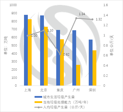 根據(jù)《2017年全國大、中城市固體廢物污染環(huán)境防治年報》,2016年我國城市生活垃圾產(chǎn)生量上海居首,北京次之??紤]到常住人口,人均生活垃圾產(chǎn)生量最大的城市為廣州,深圳次之??梢钥闯瞿戏匠鞘猩罾娜司a(chǎn)量相對較高,E20研究院認(rèn)為這可能與不同地域人口飲食習(xí)慣不同存在關(guān)系。結(jié)合當(dāng)年各城市實際處理能力來看,廣州缺口明顯,且人均垃圾產(chǎn)生量大,垃圾圍城形勢最為嚴(yán)峻。本文僅選取人均日均生活垃圾產(chǎn)生量在1公斤左右的四座一線城市:廣州、深圳、北京、上海進(jìn)行分析。