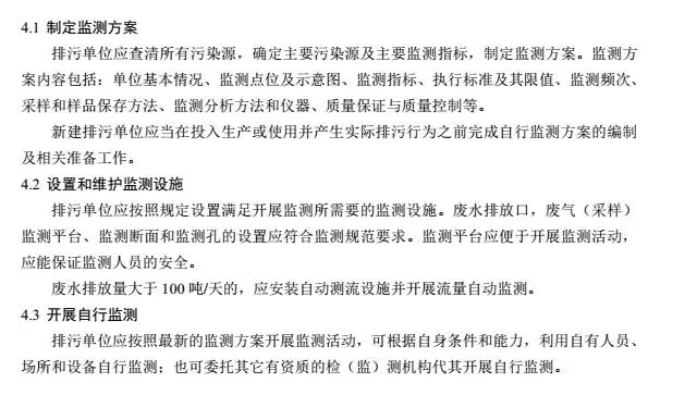 一是自行監(jiān)測的一般要求,即制定監(jiān)測方案、設置和維護監(jiān)測設施、開展自行監(jiān)測、做好監(jiān)測質量保證與質量控制、記錄保存和公開監(jiān)測數(shù)據(jù)的基本要求;