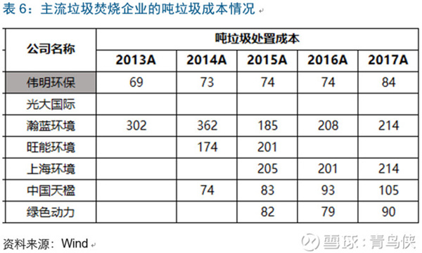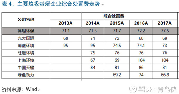 偉明環(huán)保的綜合垃圾處置單價約77.5元/噸,排在行業(yè)中等,最高的是上海環(huán)境,高達(dá)104元/噸