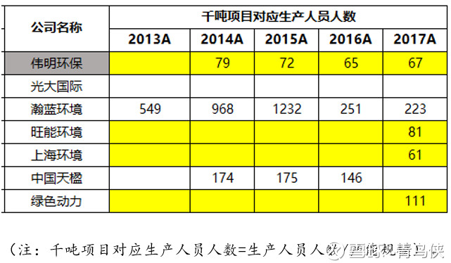 偉明環(huán)保的千噸項目所需生產(chǎn)人員僅僅67人,遠(yuǎn)低于旺能環(huán)境的81人,綠色動力的111人,中國天楹由于一半營收來之設(shè)備銷售,因此即使去除一半人數(shù),千噸項目所需人員也在70-80之間。翰藍(lán)業(yè)務(wù)較多,單獨(dú)看綠電焚燒項目,大約有200號人。(上海環(huán)境偏少因為有部分派遣員工)