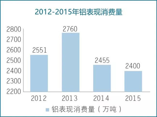 2015年全球原鋁需求為5,771萬噸,較2014年上升386.9萬噸。2015年全球原鋁產(chǎn)量增加410.3萬噸。中國區(qū)域鋁表觀消費者由2012年的2551萬噸下降到2015年的2400萬噸。