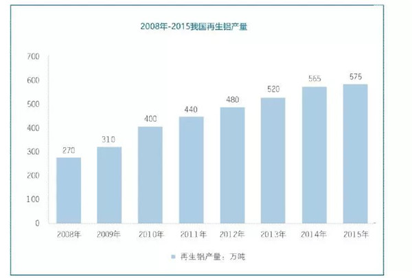 2008年中國再生鋁產(chǎn)量為270萬噸,近年來由于有道國家宏觀調(diào)控,各種能源可再生政策發(fā)布,以及我國“十二五”和“十三五”可持續(xù)發(fā)展的要求,我國鋁再生產(chǎn)業(yè)發(fā)展速度,2015年再生鋁產(chǎn)量達到了575萬噸,同時鋁再生平均增長率達到12.3%。