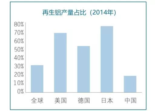 發(fā)達國家的再生鋁產(chǎn)量已經(jīng)普遍超過原鋁產(chǎn)量。根據(jù)USGS的統(tǒng)計數(shù)據(jù),2014年美國再生鋁產(chǎn)量為364萬噸,而原鋁產(chǎn)量僅為171萬噸,再生鋁產(chǎn)量占總產(chǎn)量的68%,日本2014 年的再生鋁產(chǎn)量占總產(chǎn)量的76%。