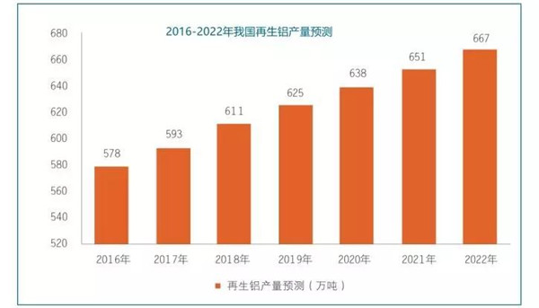 近年來,經(jīng)濟發(fā)展突飛猛進,隨之而來的便是節(jié)約資源、保護環(huán)境等要求,中國再生鋁企業(yè)受益迅速成長。2008年,再生鋁產(chǎn)量達到270萬噸,至2015達到575萬噸。由于受到國內(nèi)鋁市供需不平衡的影響,近幾年鋁價下降維持平穩(wěn),局部小反彈,大多數(shù)再生鋁企業(yè)利潤提升,再生鋁行業(yè)未來前景開始回升。按照2006年到2015再生鋁的增長趨勢,預(yù)計2016再生鋁產(chǎn)量達到578萬噸,2022年再生鋁產(chǎn)量達到667萬噸。