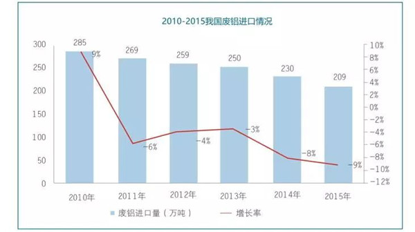 中國鋁儲存量雖然多,但是我國可持續(xù)發(fā)展戰(zhàn)略要鋁資源是需要循環(huán)利用的,所以我國不但國內(nèi)回收廢鋁,每年還會進口回收國外的廢鋁,2010年我國廢鋁進口285萬噸,同比增長9%。2015年我國進口廢鋁209萬噸,同比下降9%。