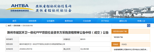 安徽省滁州市城區(qū)環(huán)衛(wèi)一體化PPP項目發(fā)布資格預(yù)審結(jié)果公告,北京環(huán)境、啟迪桑德和軒昂環(huán)保三家企業(yè)入圍。