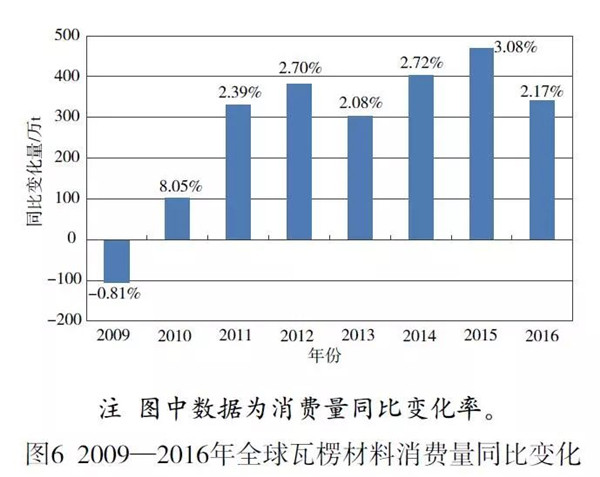隨著全球經(jīng)濟的發(fā)展以及人們生活水平的不斷提高,具有綠色環(huán)保及成本效益優(yōu)勢的包裝紙及紙板等紙質包裝材料的需求量保持持續(xù)增長。其中,包裝紙及紙板產(chǎn)品結構中占比達70% 的瓦楞材料(瓦楞原紙和箱紙板),在全球紙及紙板產(chǎn)量中的占比高達40%。2016 年全球瓦楞材料生產(chǎn)量16144萬t,比2015 年增長2.31%,占全球紙及紙板總生產(chǎn)量的39.29% ; 消費量16083 萬t, 比2015 年增長2.17%,占全球紙及紙板總消費量的38.89%。目前全球的瓦楞材料產(chǎn)品的纖維原料結構中,廢紙漿的占比高達80%。因此,受瓦楞材料需求持續(xù)增長影響(見圖6),未來全球廢紙需求量仍將持續(xù)增加;其次,一些國家為了節(jié)約資源、保護環(huán)境,不斷加大廢紙利用力度,尤其是中國、印度、泰國、印度尼西亞、越南等發(fā)展中國家和地區(qū)廢紙需求量近年快速增加。