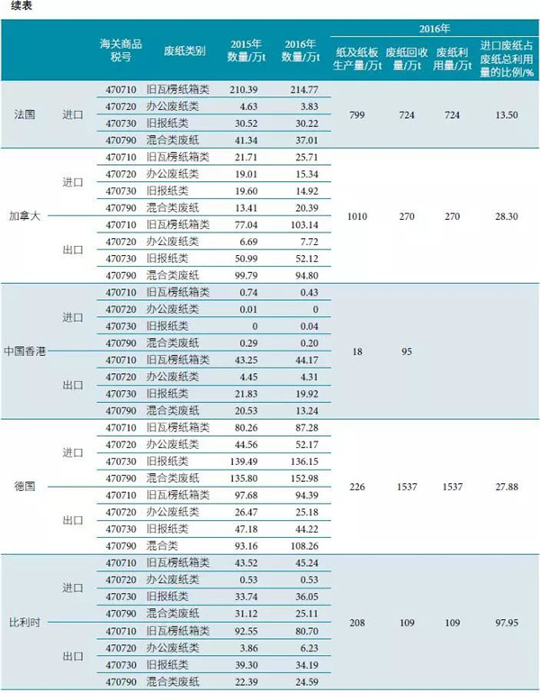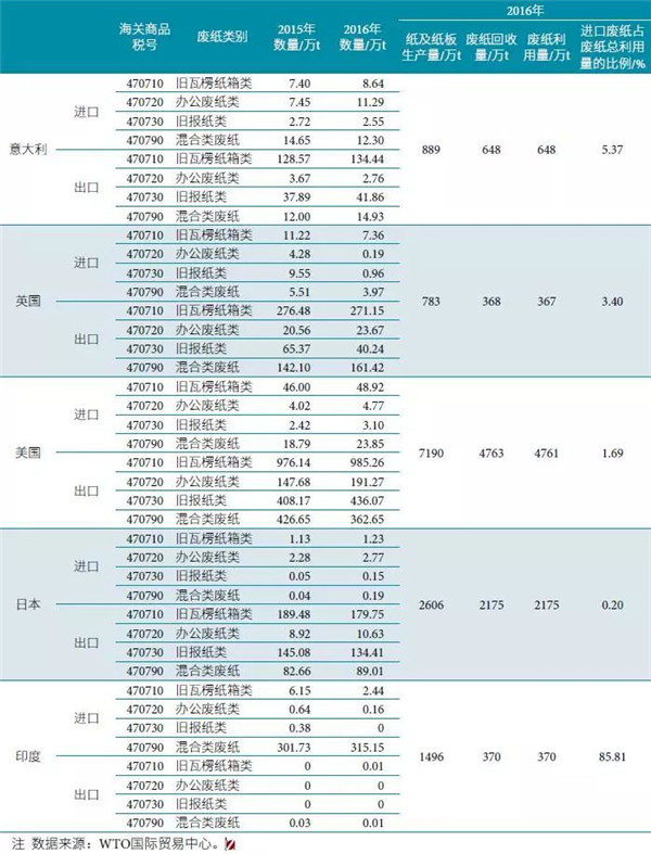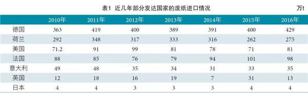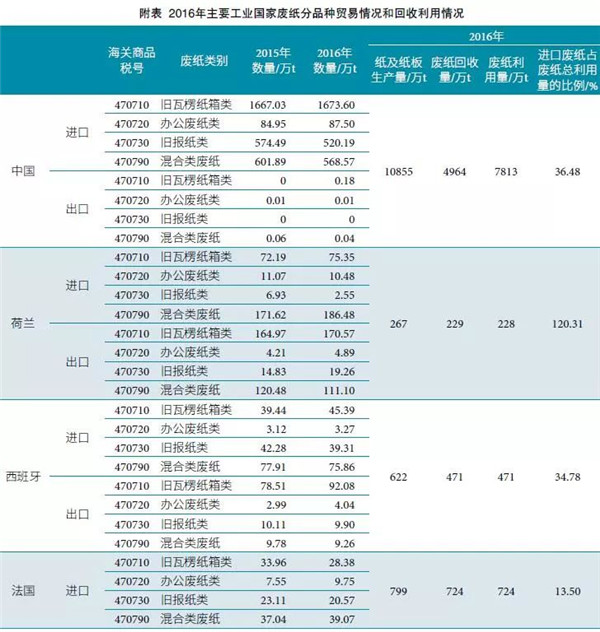 美國、日本、德國、荷蘭、英國等發(fā)達國家都十分重視廢紙的資源化利用,根據(jù)需要,每年會不同程度地進口一定數(shù)量的廢紙(見表1)。其中,花園式國家荷蘭,每年的廢紙進口量基本都在300 萬t 左右,從數(shù)量上相當于其紙及紙板的生產(chǎn)幾乎全部使用進口廢紙。附表列出了2016 年主要工業(yè)國家廢紙分品種貿(mào)易情況和回收利用情況。