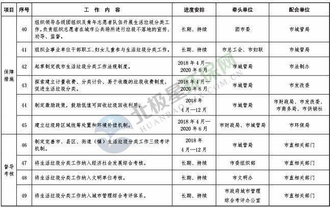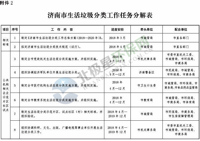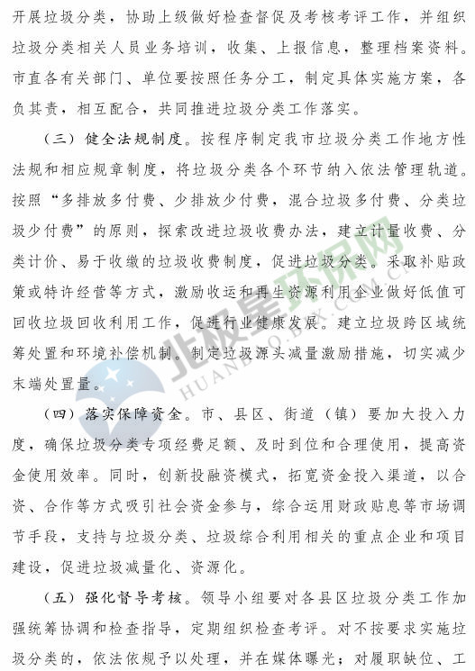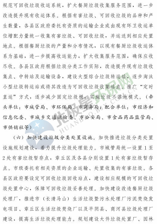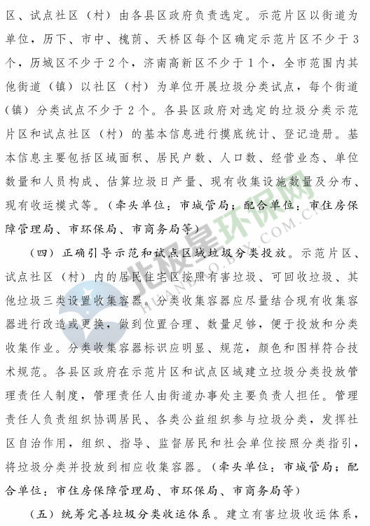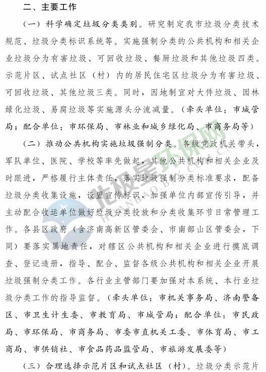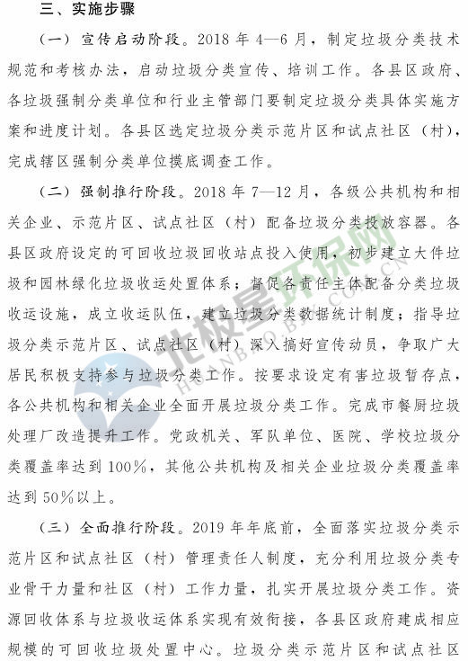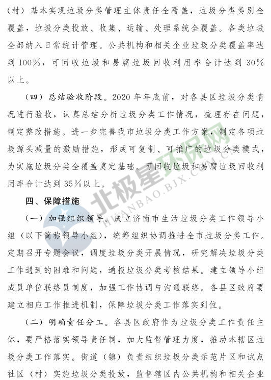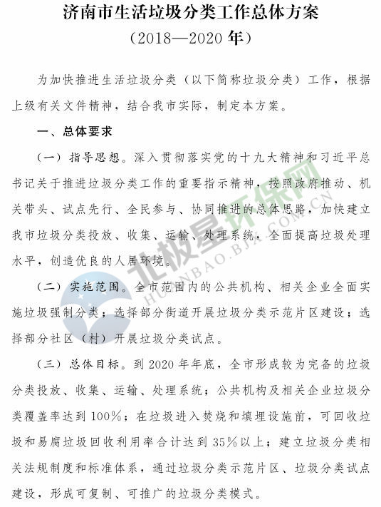 《濟(jì)南市生活垃圾分類工作總體方案(2018—2020年)》已經(jīng)印發(fā),《方案》提出,到 2020 年年底,全市形成較為完備的垃圾分類投放、收集、運(yùn)輸、處理系統(tǒng);公共機(jī)構(gòu)及相關(guān)企業(yè)垃圾分類覆蓋率達(dá)到 100% ;在垃圾進(jìn)入焚燒和填埋設(shè)施前,可回收垃圾和易腐垃圾回收利用率合計達(dá)到 35% 以上;建立垃圾分類相關(guān)法規(guī)制度和標(biāo)準(zhǔn)體系,通過垃圾分類示范片區(qū)、垃圾分類試點(diǎn)建設(shè),形成可復(fù)制、可推廣的垃圾分類模式。詳情如下: