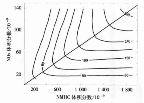 因此,當(dāng)二氧化硫超標(biāo),削減其排放就能達(dá)到減少污染的目的。但是,這種方法不能直接用于對(duì)臭氧的控制。學(xué)界認(rèn)為,臭氧治理需利用EKMA曲線,通過(guò)控制臭氧前體物NOx和VOCs來(lái)控制臭氧。