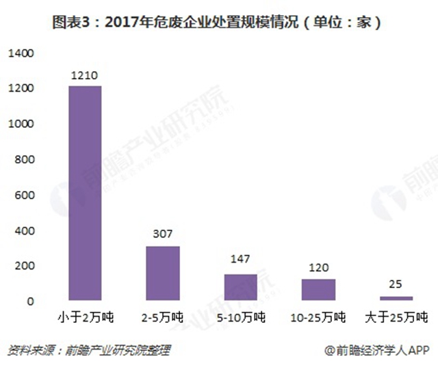 正因此,我國危廢處理行業(yè)參與者較多,但企業(yè)規(guī)模普遍較小。根據(jù)2017年7月的數(shù)據(jù)統(tǒng)計,我國危廢處理企業(yè)產(chǎn)能低于2萬噸、2-5萬噸、5-10萬噸、10-25萬噸和25萬噸以上的企業(yè)數(shù)量分別為1210家、307家、147家、120家和25家,67%的企業(yè)危廢處理產(chǎn)能低于2萬噸。