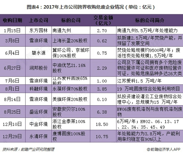 由于危廢處理處臵行業(yè)市場毛利率高,現(xiàn)金流好,且在未來的幾年間供需關(guān)系將持續(xù)緊張的大背景下,項目的盈利能力有進一步提升的空間,因此具備資金和項目管理優(yōu)勢的上市環(huán)保公司出于產(chǎn)業(yè)布局和財務(wù)投資的角度,在最近兩年(特別是2017年后)通過并購的方式大舉進入危廢領(lǐng)域。