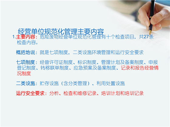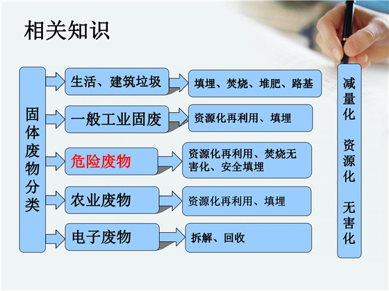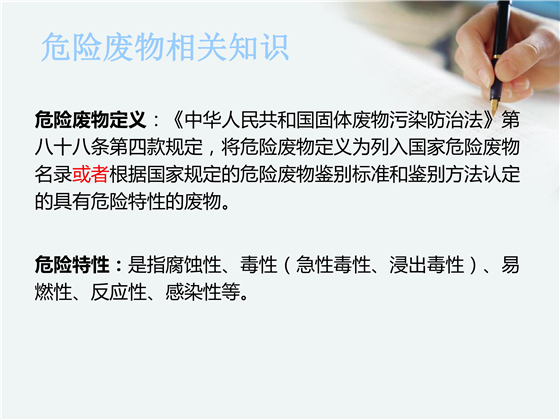 2018年石家莊市固體廢物管理培訓(xùn)會(huì)議課件日前公布,其中,“危險(xiǎn)廢物法律法規(guī)和標(biāo)準(zhǔn)規(guī)范”共108張PPT,從固體廢物相關(guān)知識(shí)、我國(guó)危險(xiǎn)廢物的主要法律制度、危險(xiǎn)廢物規(guī)范化管理指標(biāo)體系、2018年度危險(xiǎn)廢物規(guī)范化管理督查考核四方面進(jìn)行了詳細(xì)闡述。詳情如下: