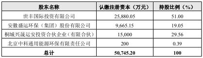 本次世豐國際以自有資金共計 25,880.05 萬元人民幣,通過增資的方式,獲得標的公司 51%的股權(quán),盛運環(huán)保持有標的公司 19.05%的股權(quán),桐城興晟運安投資合伙企業(yè)(有限合伙)持有標的公司 29.56%的股權(quán),北京中科通用能源環(huán)保有限責(zé)任公司持有標的公司 0.39%。