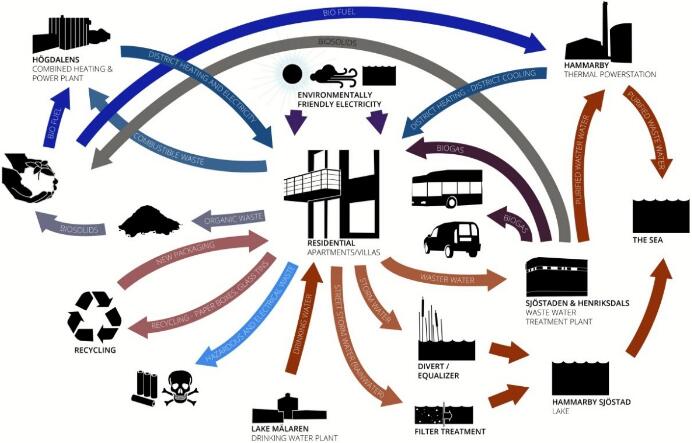 其中,1996年由斯德哥爾摩水公司、Fortum (能源公司) 和城市廢物回收公司合作開發(fā)的哈馬碧生態(tài)模型至關(guān)重要。該模型的主要原理是最大程度地實現(xiàn)材料和能源流的局部閉環(huán)。它展示了如何將廢物回收、水、地區(qū)供暖供冷和交通,與城市規(guī)劃、景觀及建筑設(shè)計進(jìn)行整合, 最大限度地減少材料和能源的消耗。
