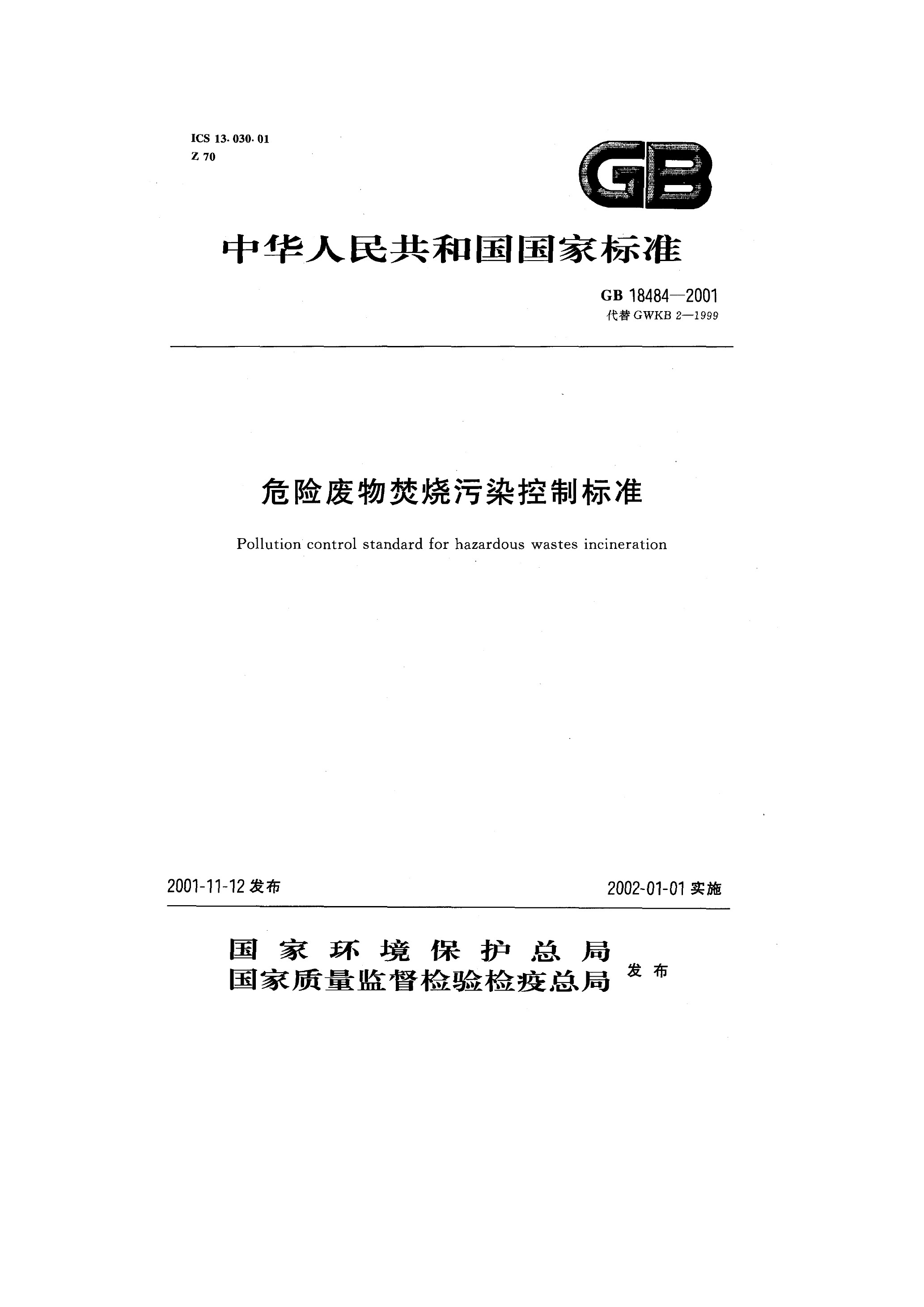 危險(xiǎn)廢物焚燒污染控制標(biāo)準(zhǔn)(GB18484-2001)