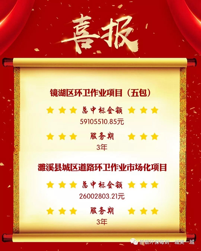 2018年12月7日,蕪湖市公共資源交易服務網發(fā)布公告,僑銀環(huán)保中標鏡湖區(qū)環(huán)衛(wèi)作業(yè)項目(五包),總中標金額為59105510.85元,服務期為3年。