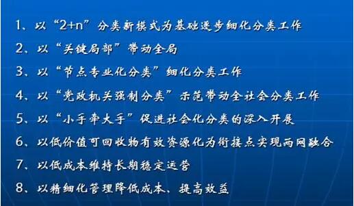 針對垃圾分類現(xiàn)狀及存在問題,陳海濱提出了推進(jìn)分類工作八條切入點/著力點。包括以2+N分類新模式為基礎(chǔ)逐步細(xì)化分類工作,以干濕分類為主,簡化分類方式;以關(guān)鍵局部帶動全局,分類主體的關(guān)鍵局部主要包含學(xué)生和干部;以節(jié)點專業(yè)化分類細(xì)化分類工作等。