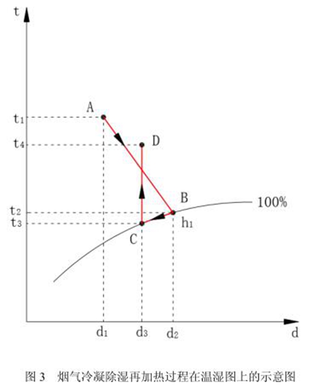 這是一個等焓增濕的過程。采用直接或間接的方式對飽和狀態(tài)B的煙氣進(jìn)行冷卻,部分汽態(tài)水釋放氣化潛熱發(fā)生相變而凝結(jié)為液態(tài)水,順著等100%的相對濕度線從B點處理到C點,煙氣仍為相對濕度100%的飽和煙氣,但絕對濕度降低為d2-d3,煙氣中的水蒸氣含量降低。
