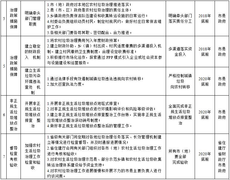 (一)制定農(nóng)村生活垃圾治理方案。各市(地)、縣(市、區(qū))要結(jié)合實際,堅持按照“統(tǒng)籌考慮、分類指導(dǎo)、經(jīng)濟適用、保證效果”的原則,制定本地區(qū)農(nóng)村生活垃圾治理三年行動方案。方案要重點確定農(nóng)村生活垃圾處理目標(biāo)任務(wù)、資金投入、責(zé)任部門和保障措施,合理選擇收運處置模式和技術(shù)路線,明確各階段垃圾治理工作重點,細化年度建設(shè)任務(wù)。各縣(市、區(qū))制定方案后,要組織編制本地區(qū)農(nóng)村生活垃圾治理設(shè)施建設(shè)專項規(guī)劃方案,充分考慮空間居民點布局調(diào)整和環(huán)境影響因素,科學(xué)確定整治村范圍、收集轉(zhuǎn)運處理設(shè)施布局和建設(shè)規(guī)模,并經(jīng)專家論證通過后實施。各市縣《農(nóng)村生活垃圾治理方案》于2019年3月底前報省住建廳備案。