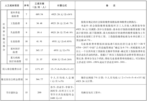 (二)環(huán)衛(wèi)用工成本指導價包括基礎工資、環(huán)衛(wèi)崗位津貼、環(huán)衛(wèi)工人工齡工資、高溫津貼、加班或者延長工作時間工資、國家法定節(jié)日和市環(huán)衛(wèi)工人節(jié)慰問金、社會保險(單位繳納部分)、住房公積金(單位繳納部分)8個部分,其他項目按照現(xiàn)有的法律、法規(guī)執(zhí)行。