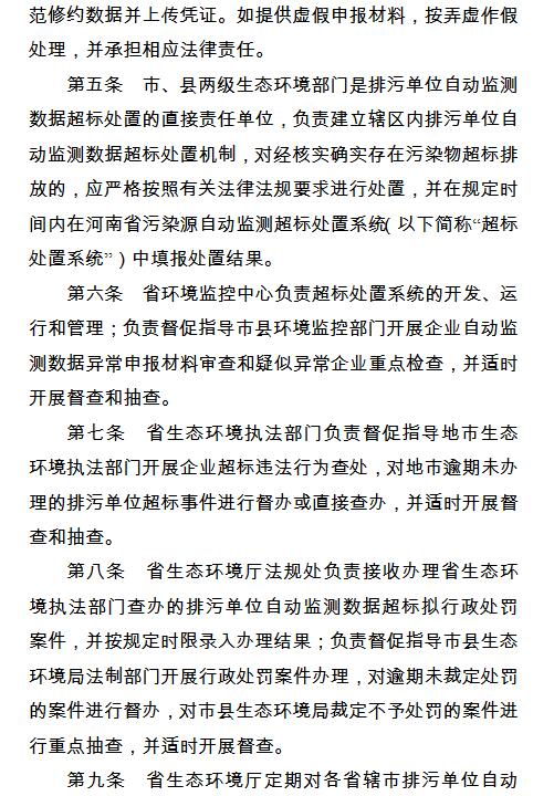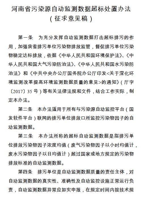 日前,河南印發(fā)《河南省污染源自動監(jiān)測數(shù)據(jù)超標(biāo)處置辦法(征求意見稿)》。全文如下: