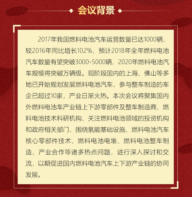 本次大會將聚集國內(nèi)外燃料電池車產(chǎn)業(yè)鏈上下游零部件及整車制造商、燃料電池技術(shù)科研機構(gòu)、關(guān)注燃料電池領(lǐng)域的投資機構(gòu)和政府相關(guān)部門,圍繞氫能基礎(chǔ)設(shè)施、燃料電池汽車核心零部件技術(shù)、燃料電池電堆、燃料電池整車制造、產(chǎn)業(yè)合作等諸多熱點問題,進行深入探討和交流。