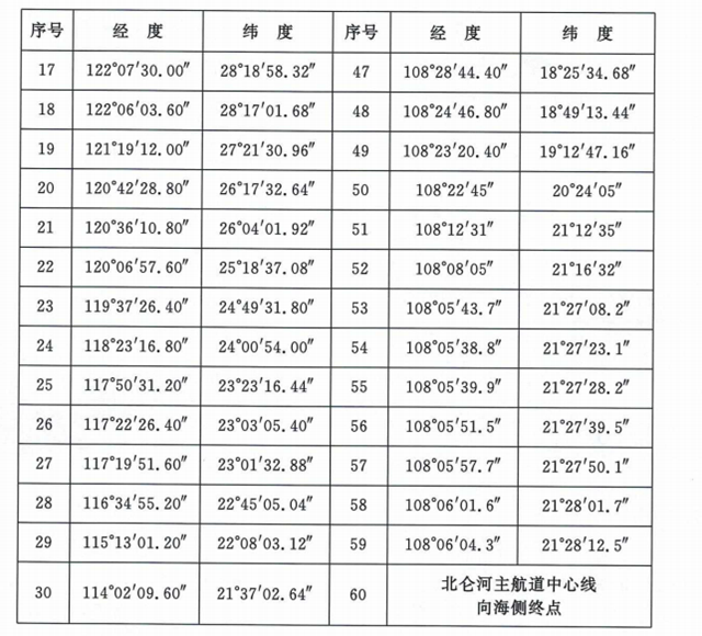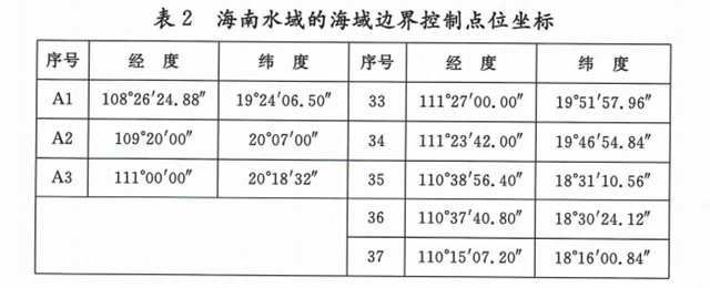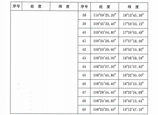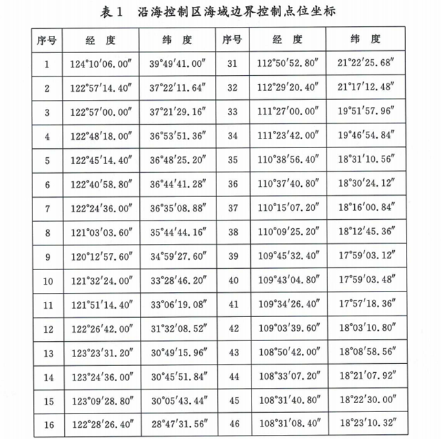 沿??刂茀^(qū)范圍為表1所列60個(gè)點(diǎn)依次連線以內(nèi)海域,其中海南水域范圍為表2所列20個(gè)點(diǎn)依次連線以內(nèi)海域。
