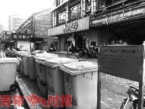 在垃圾分類工作中,可能最頭痛的還是廚余垃圾,因為不少是濕答答、有氣味的?!皬N余垃圾桶我們一般都是讓商家到了清運時間再拿出來,不然的話太影響環(huán)境了。”徐瑋棟說,商家產(chǎn)生的廚余垃圾,去年整個上城區(qū)日均是30噸,今年日均預計會達到50噸,“商家放廚余垃圾的垃圾桶,我們出標準后由店家自行采購,桶色要求必須是綠色的,這樣方便清運工人識別。”