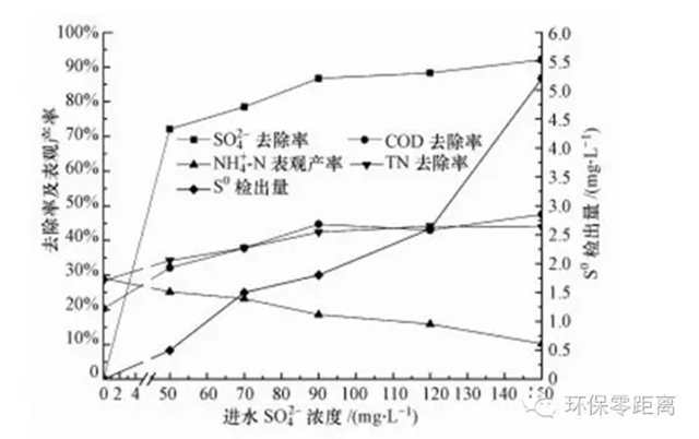 菌種鑒定確定了UASB反應(yīng)器內(nèi)存在硫酸鹽還原、脫硫反硝化和硝化反硝化, 而硫酸鹽還原反應(yīng)脫出的O可能被硝化菌及其它細(xì)菌撲捉參與硝化和有機(jī)物降解, 工藝運(yùn)行中也發(fā)現(xiàn), 隨著進(jìn)水SO42-含量的波動(dòng), UASB反應(yīng)器內(nèi)COD、TN、S2-等指標(biāo)也相應(yīng)存在細(xì)微的變動(dòng), 因此, 猜測硫酸鹽還原作用影響著硝化反硝化、脫硫反硝化及COD去除.為了試著驗(yàn)證這一猜想, 進(jìn)行了硫酸鹽含量對UASB運(yùn)行影響實(shí)驗(yàn).考慮到采用中試裝置研究會(huì)存在SO42-含量不易精確控制、藥劑投加量大和研究成本高等問題, 因此, 采用小試研究.