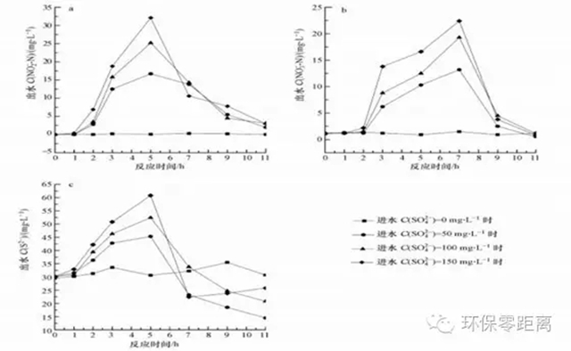 圖 7進(jìn)水C(SO42-)對UASB反應(yīng)咯呆全內(nèi)NO2--N、NO3--N、S2-指標(biāo)隨反應(yīng)時(shí)間變動(dòng)的影響