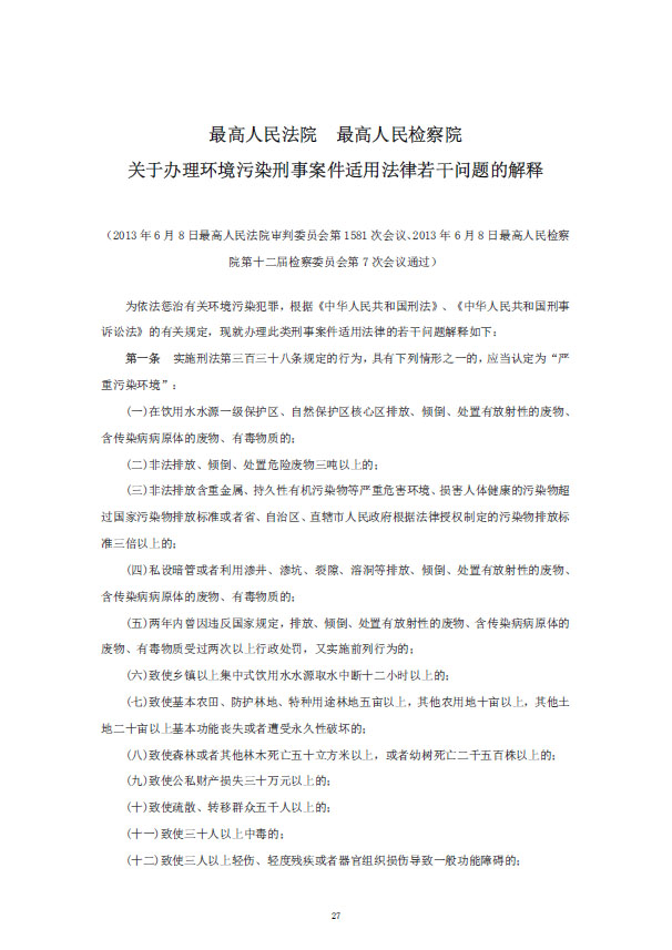 關(guān)于辦理環(huán)境污染刑事案件適用法律若干問(wèn)題的解釋