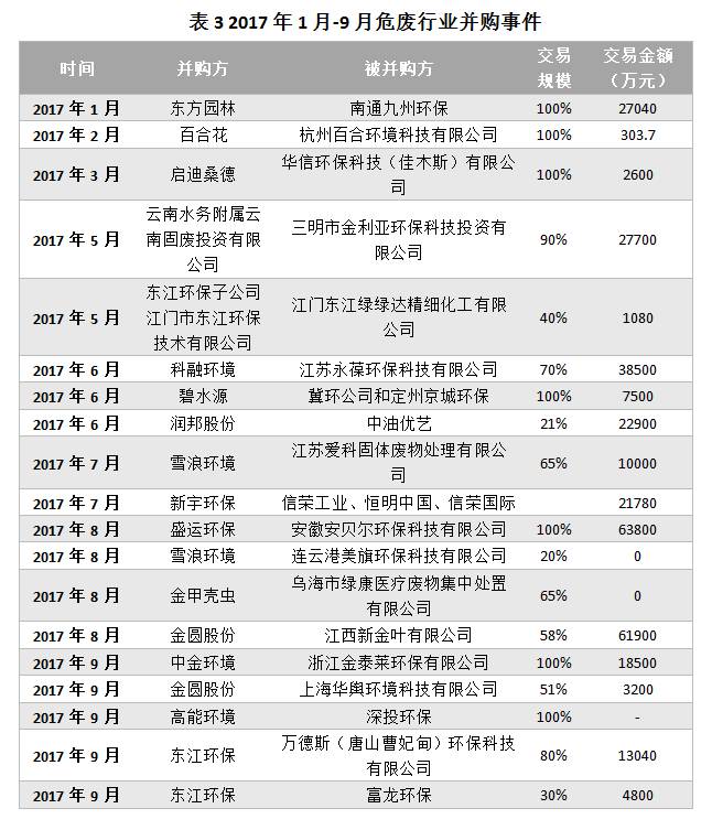 根據(jù)已有公開數(shù)據(jù)的不完全統(tǒng)計(jì),截至2017年9月,2017年危廢行業(yè)發(fā)起并購行為19起起,累積交易金額32.46億元,并購方既包括像東江環(huán)保、啟迪桑德、新宇環(huán)保這樣的“行業(yè)老兵”,也不乏碧水源、盛運(yùn)環(huán)保、中金環(huán)境等“后起之秀”,更有金圓股份等“跨界來者”。