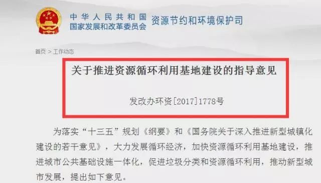 為落實“十三五”規(guī)劃《綱要》和《國務院關于深入推進新型城鎮(zhèn)化建設的若干意見》,大力發(fā)展循環(huán)經濟,加快資源循環(huán)利用基地建設,推進城市公共基礎設施一體化,促進垃圾分類和資源循環(huán)利用,推動新型城市發(fā)展,提出如下意見。
