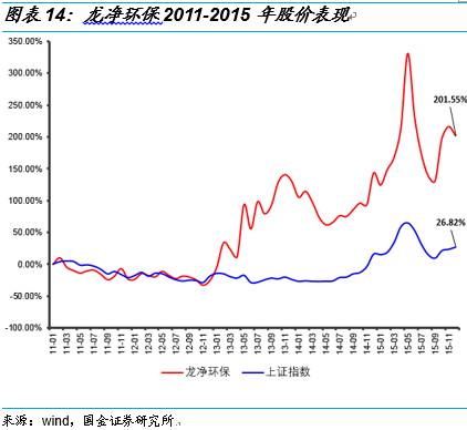 龍凈環(huán)保依靠其SCR煙氣脫硝技術(shù)將圓盤回旋混流技術(shù)與AIG氨噴射技術(shù)進(jìn)行有機(jī)結(jié)合,可保證氨/煙氣混合更加均勻;氨氣流量調(diào)節(jié)采用氣動(dòng)薄膜單座直通式調(diào)節(jié)閥組來實(shí)現(xiàn),具有線性調(diào)節(jié)性好、反應(yīng)動(dòng)作快、調(diào)節(jié)穩(wěn)定、密封性能好等優(yōu)點(diǎn),既可保證高脫硝率,又能準(zhǔn)確控制氨流量,保證氨逃逸率。采用該先進(jìn)技術(shù),可保證脫硝率達(dá)90%以上,氨逃逸<2.5ppm,SO2/SO3轉(zhuǎn)化率<1%。在2015年中電聯(lián)公布的簽訂合同的火電廠煙氣脫硝機(jī)組容量情況中,龍凈環(huán)保排名全國(guó)第二。隨著脫硝市場(chǎng)的快速釋放和業(yè)績(jī)的增加,公司股價(jià)從2011年初到2015年底上漲201.55%,跑贏上證指數(shù)175個(gè)百分點(diǎn),公司市值也由2011年初的71.5億增加至2015年底的185億。