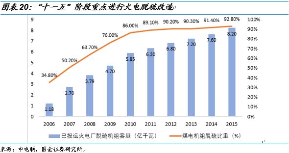 例如火電脫硫脫硝超低排放呈現(xiàn)階段性并進(jìn)入了成熟期,在“十一五”期間重點(diǎn)進(jìn)行全國(guó)煤電機(jī)組脫硫改造,全國(guó)煤電機(jī)組脫硫機(jī)組占比從2006年的34.80%快速提升至2010年的86%?!笆濉敝攸c(diǎn)進(jìn)行了煤電脫硝改造,全國(guó)煤電機(jī)組脫硝比重從2011年的9.80%快速增長(zhǎng)到了2015年的95%?!笆濉逼陂g重點(diǎn)進(jìn)行了超低排放改造,截止2017年底,全國(guó)范圍內(nèi)超低排放改造目標(biāo)任務(wù)完成率已達(dá)71%,東部地區(qū)已基本完成,部分中部地區(qū)省份也提前完成了改造任務(wù),預(yù)計(jì)2020年全國(guó)將全部火電超低排放改造。