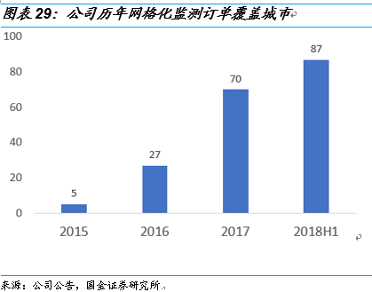 網(wǎng)格化監(jiān)測(cè)系統(tǒng)有望成為城市空氣治理之標(biāo)配。在國(guó)家生態(tài)環(huán)境部開展城市空氣質(zhì)量排名的考核排名壓力下,部分省市開始將空氣質(zhì)量考核排名下沉到對(duì)鄉(xiāng)鎮(zhèn)空氣質(zhì)量考核,進(jìn)而開始建設(shè)鄉(xiāng)鎮(zhèn)站空氣監(jiān)測(cè)項(xiàng)目,2018年上半年公司陸續(xù)中標(biāo)河南鶴壁,山東菏澤,河北保定、唐山及張家口等地鄉(xiāng)鎮(zhèn)站空氣監(jiān)測(cè)建設(shè)項(xiàng)目。我們認(rèn)為隨著城市空氣質(zhì)量排名從地級(jí)市下沉到縣級(jí)市,并且環(huán)保督察的持續(xù)高壓,網(wǎng)格化監(jiān)測(cè)有望成為城市空氣治理的標(biāo)配。