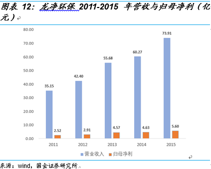 政策的大力支持帶動(dòng)了火電脫硝機(jī)組的快速增長(zhǎng),全國(guó)煤電機(jī)組脫硝比重從2011年的9.80%快速增長(zhǎng)到了2015年的95%。與此同時(shí),脫硝機(jī)組的改造帶動(dòng)了相應(yīng)市場(chǎng)需求的快速釋放,從事大氣污染控制領(lǐng)域的上市公司龍凈環(huán)保的營(yíng)業(yè)收入和歸母凈利從2011年的35.15億和2.52億,快速增長(zhǎng)到了2015年的73.91億和5.60億,復(fù)合增長(zhǎng)率分別達(dá)到了20.42%和22.10%。