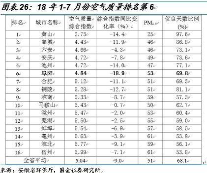 截至8月14日,阜陽(yáng)市空氣質(zhì)量綜合指數(shù)由去年同期的第13名上升至第6名;PM2.5平均濃度51微克/立方米,較去年同期下降25.0%,降幅居全省第2位;優(yōu)良天數(shù)156天,同比增加27天。在生態(tài)環(huán)境部發(fā)布的2018年上半年全國(guó)空氣質(zhì)量狀況通報(bào)中,阜陽(yáng)空氣質(zhì)量改善幅度居全國(guó)169個(gè)城市第5位。