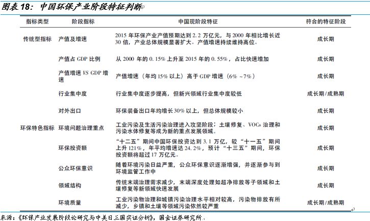 環(huán)保行業(yè)具有逆周期性和階段性,我國(guó)環(huán)保行業(yè)正處于成長(zhǎng)期。環(huán)保行業(yè)發(fā)展的前提是經(jīng)濟(jì)高速增長(zhǎng)帶來的資源耗損和污染積累,這使環(huán)保行業(yè)形成與發(fā)展上滯后于經(jīng)濟(jì)的快速發(fā)展期。當(dāng)經(jīng)濟(jì)增長(zhǎng)向中高速發(fā)展甚至下滑時(shí),之前經(jīng)濟(jì)高速發(fā)展所掩蓋的資源環(huán)境問題開始凸顯并受到重視。另外在經(jīng)濟(jì)衰退過程中,政府還將依靠財(cái)政投資來拉動(dòng)低迷的經(jīng)濟(jì)增長(zhǎng)。此時(shí),具有基礎(chǔ)設(shè)施建設(shè)內(nèi)容、與國(guó)民經(jīng)濟(jì)其他部門關(guān)聯(lián)性強(qiáng)、具有綜合效益的環(huán)保產(chǎn)業(yè)也將得到大量的資金投入,帶動(dòng)其快速發(fā)展。因此環(huán)保產(chǎn)業(yè)的形成與發(fā)展具有較強(qiáng)的逆經(jīng)濟(jì)周期性。我國(guó)環(huán)保產(chǎn)業(yè)發(fā)展正處于成長(zhǎng)期向成熟期的邁進(jìn)的重要階段,在中長(zhǎng)期內(nèi)仍有較大的發(fā)展空間和潛力。