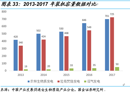2017 年,垃圾焚燒發(fā)電裝機(jī)容量達(dá)725.1萬千瓦,較上年增長(zhǎng)32.1%;農(nóng)林生物質(zhì)發(fā)電裝機(jī)容量達(dá)700.77萬千瓦,較上年增長(zhǎng)8.4%;沼氣發(fā)電裝機(jī)容量達(dá)49.9萬千瓦,較上年增長(zhǎng)42.9%。2017 年,垃圾焚燒發(fā)電裝機(jī)容量增長(zhǎng)速度快于農(nóng)林生物質(zhì)裝機(jī)容量增速,垃圾發(fā)電裝機(jī)容量5 年內(nèi)首次超過農(nóng)林生物質(zhì)發(fā)電裝機(jī)容量。