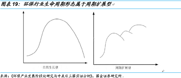 常杪在《環(huán)保產(chǎn)業(yè)發(fā)展階段論研究與中美日三國(guó)實(shí)證分析》提出,環(huán)保產(chǎn)業(yè)的生命周期形態(tài)屬于周期擴(kuò)展型,即隨著環(huán)保產(chǎn)業(yè)的發(fā)展和環(huán)境質(zhì)量的改善,環(huán)保產(chǎn)業(yè)發(fā)展重心將根據(jù)需求的變化而發(fā)生改變,進(jìn)而帶來新的周期性發(fā)展。