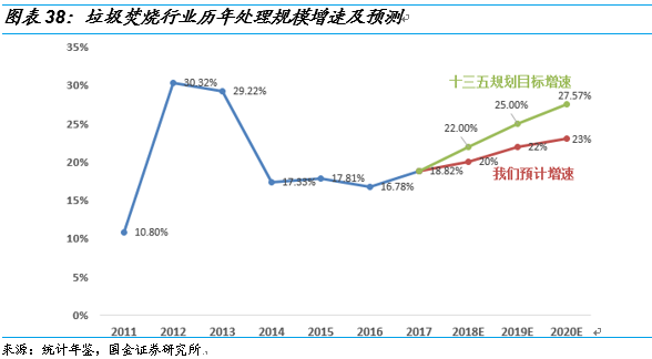 其次,雖然我國(guó)垃圾焚燒處理率提高迅速,但跟規(guī)劃仍有較大差距。我國(guó)的垃圾焚燒行業(yè)在“十二五”經(jīng)歷了快速增長(zhǎng),垃圾焚燒處理率從2011年的18%迅速提升到了2016年的38%?!丁笆濉比珖?guó)城鎮(zhèn)生活垃圾無害化處理設(shè)施建設(shè)規(guī)劃》提出,“十三五”期間,全國(guó)規(guī)劃新增生活垃圾無害化處理能力50.97萬噸/日(包含“十二五”續(xù)建12.9 萬噸/日),其中垃圾焚燒處理設(shè)施規(guī)模2020年要達(dá)到59.14萬噸/日。2017年的總處理能力達(dá)到30.4萬噸/日,要完成2020年的目標(biāo),2018-2020三年的行業(yè)復(fù)合增長(zhǎng)率要達(dá)到24.83%。根據(jù)行業(yè)歷年增速及現(xiàn)有公司在建及籌建規(guī)模,我們預(yù)計(jì)2018-2020年行業(yè)增速分別是20%、22%和23%。