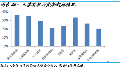 除了耕地污染,我國(guó)場(chǎng)地污染情況也很嚴(yán)重。全國(guó)土壤污染狀況調(diào)研公報(bào)中,重污染企業(yè)、工業(yè)廢棄地和工業(yè)園區(qū)的有機(jī)污染超標(biāo)均達(dá)到和超過了30%。隨著我國(guó)城鎮(zhèn)化率的提高和城市建設(shè)面積的擴(kuò)大,很多重污染企業(yè)需要搬離城區(qū),這將產(chǎn)生很大的場(chǎng)地修復(fù)需求。