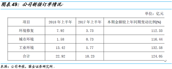 今年以來,公司項(xiàng)目拓展速度明顯加速,上半年公司三大業(yè)務(wù)板塊環(huán)境修復(fù)、城市環(huán)境和工業(yè)環(huán)境的新增訂單增速分別是112%、116%和133%,總金額達(dá)到了22.92億元。18年上半年,公司環(huán)境修復(fù)板塊實(shí)現(xiàn)收入4.28億元,同比增長(zhǎng)64.29%。