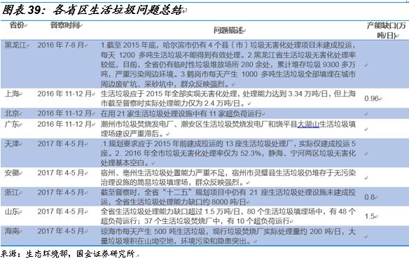 最后,我們通過生態(tài)環(huán)境部網(wǎng)站中的2016年到2017年的中央環(huán)保督察對(duì)全國(guó)31省區(qū)的督察反饋中發(fā)現(xiàn),垃圾焚燒產(chǎn)能的缺口確實(shí)存在且巨大。在31個(gè)省區(qū)中,其中有9個(gè)省區(qū)被督察到有生活垃圾無害化能力不足的問題。例如:浙江省督察時(shí)發(fā)現(xiàn)全省“十二五”規(guī)劃項(xiàng)目中仍有21座生活垃圾處理設(shè)施未建成投運(yùn),全省生活垃圾處理能力缺口約8000噸/日;山東省全省生活垃圾處理能力缺口超過1.5萬噸/日,80個(gè)生活垃圾填埋場(chǎng)中,有48個(gè)超負(fù)荷運(yùn)行。